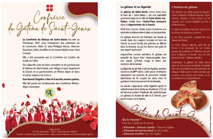 La Confrérie du Gâteau de Saint-Genix est née au printemps 2007 sous l’impulsion des 3 pâtissiers de la commune et du Grand Maître actuel.